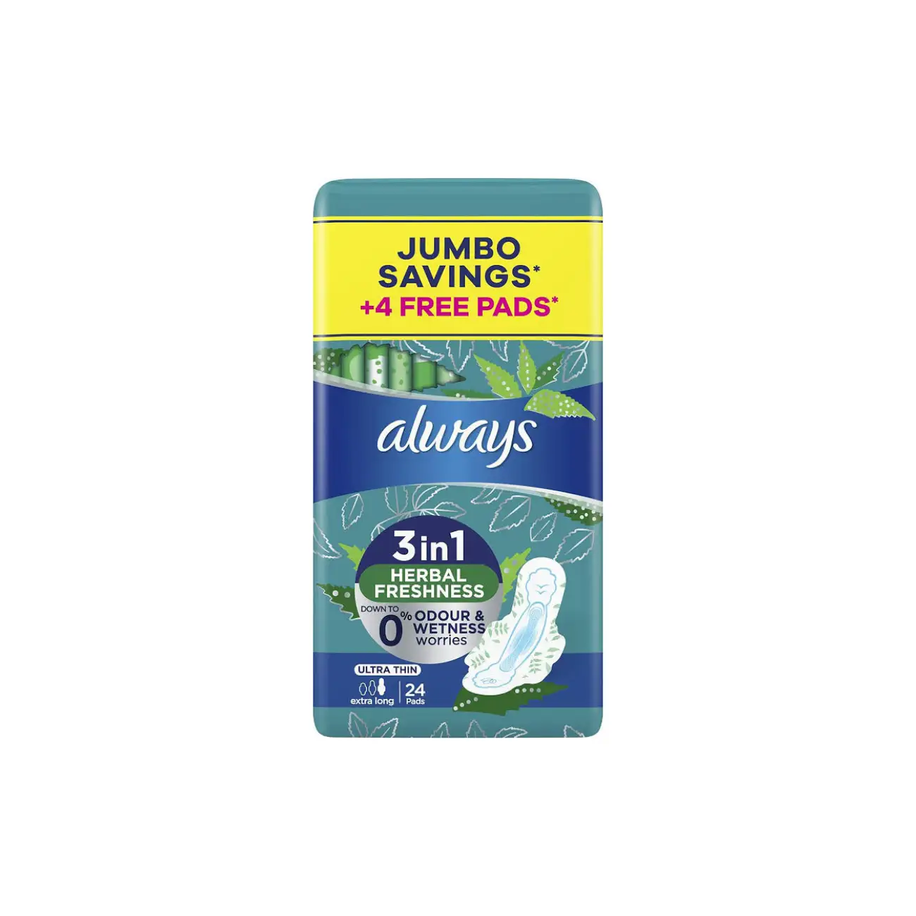 Always 3In1 Herbal Freshness Ultra Thin Extra Long Sanitary Pad With Wings, 24 Pads