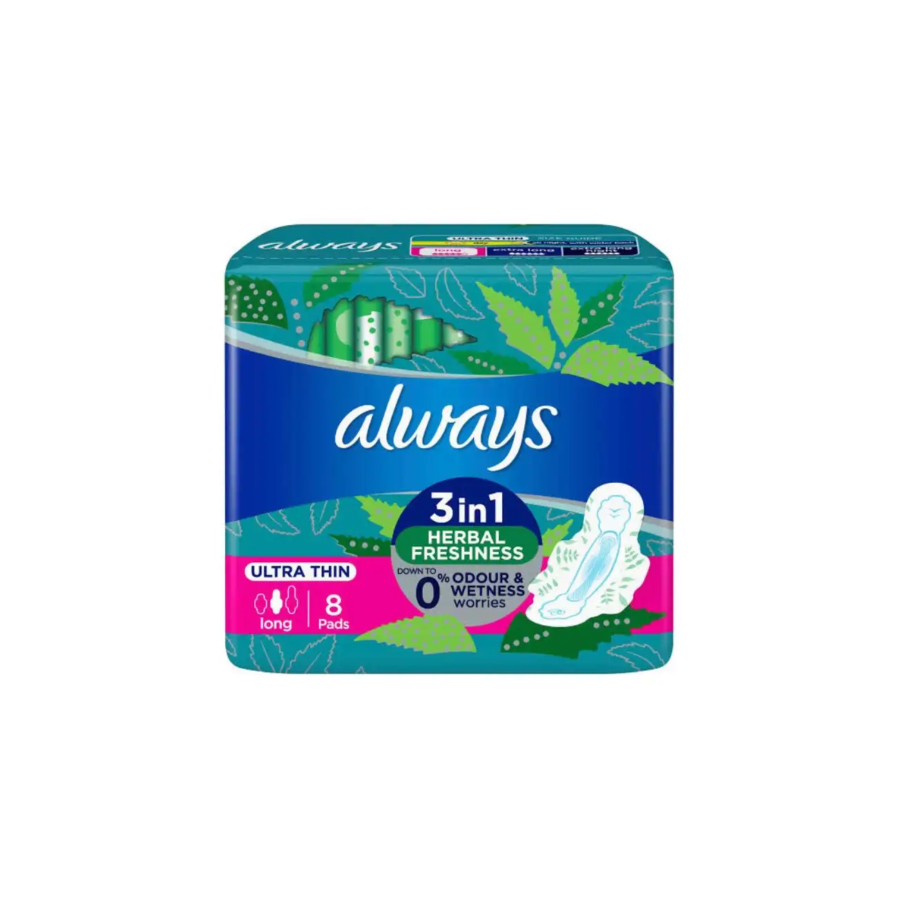 Always 3In1 Herbal Freshness Ultra Thin Long Sanitary Pad With Wings, 8 Pads