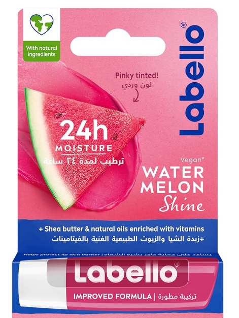 The Labello Fruity Shine Watermelon is a dual-benefit lip care product that combines 24-hour intensive moisturization with a pop of sheer color and a refreshing summer aroma. – يُعد مرطب الشفاه “لابيلو فروتي شاين ووترميلون” منتجًا للعناية بالشفاه بفوائد مزدوجة، فهو يجمع بين ترطيب مكثف لمدة 24 ساعة ولمسة من اللون الشفاف ورائحة صيفية منعشة.