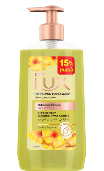 Lux Purifying Verbena is a premium antibacterial hand wash that combines the sophisticated fragrance of French Verbena with the refreshing zing of Green Tea. It is designed to offer a spa-like cleansing experience while effectively removing germs. – غسول اليدين لوكس بيوريفاينج فيربينا هو غسول فاخر مضاد للبكتيريا يجمع بين عبير زهرة الفربينا الفرنسية الفوّاح وانتعاش الشاي الأخضر. صُمم ليمنحك تجربة تنظيف فاخرة تُضاهي تجربة المنتجعات الصحية، مع إزالة الجراثيم بفعالية.